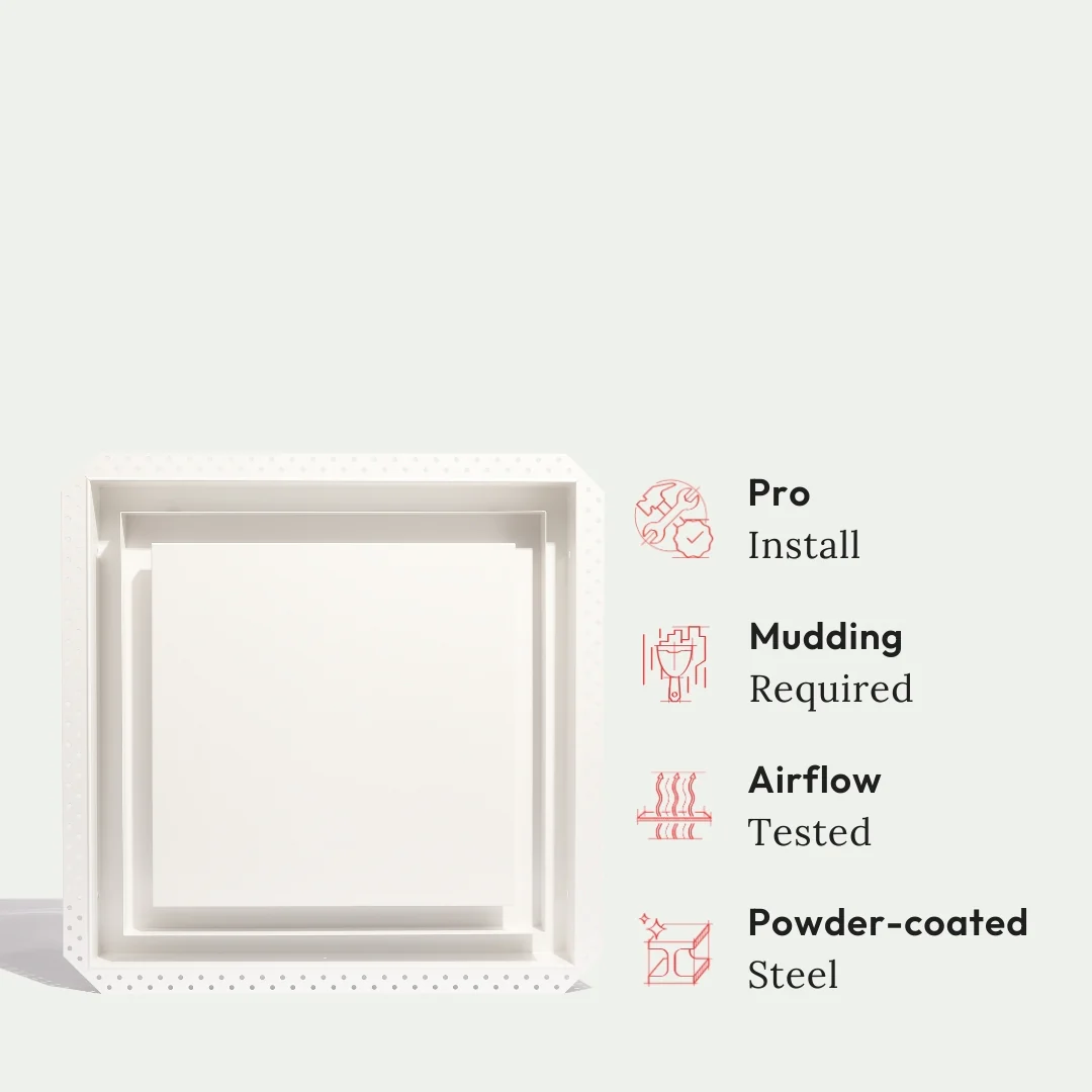 Made from solid steel and built to last, it’s the last air vent you’ll ever buy. The Flush is a refined upgrade that seamlessly integrates into the ceiling or wall. Pro install in 30 minutes. Requires drywall mudding. Drywall and HVAC-compatible.Â