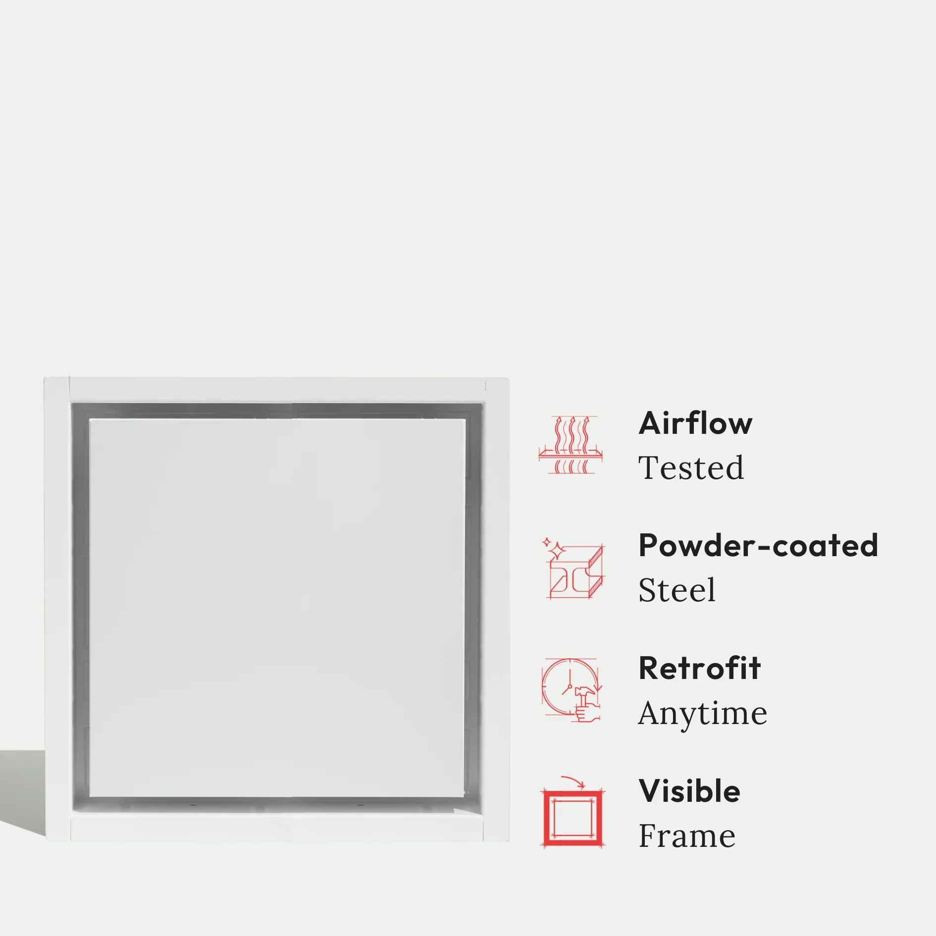 We've reimagined old-fashioned grille exhaust mounts. An innovative, ultra-minimalist design seamlessly blends right into the wall or ceiling — a customizable powder-coated steel center plate hides the mount in plain sight. Super-easy, DIY-install in 15 minutes. Retrofit anytime. Drywall-compatible.